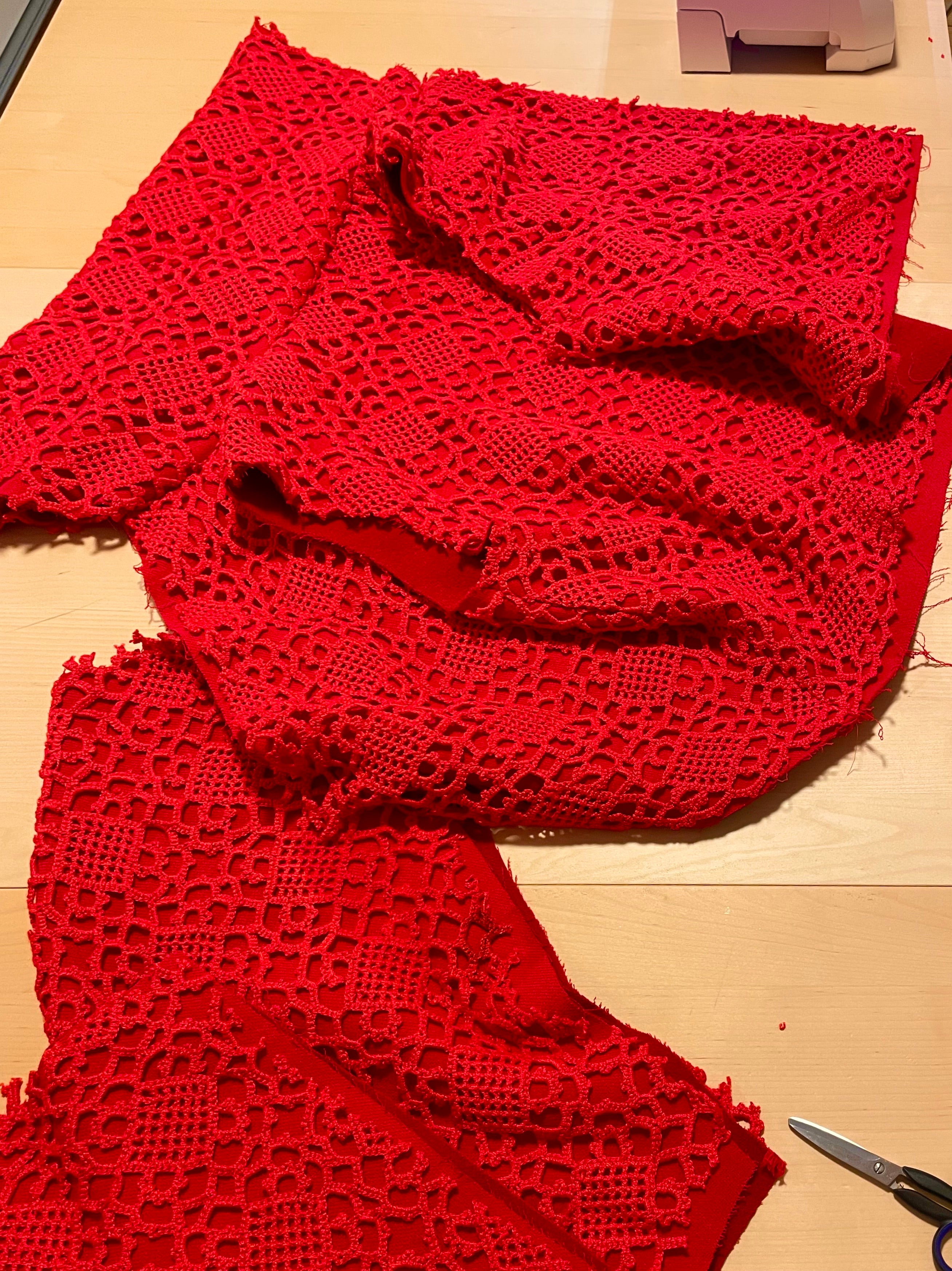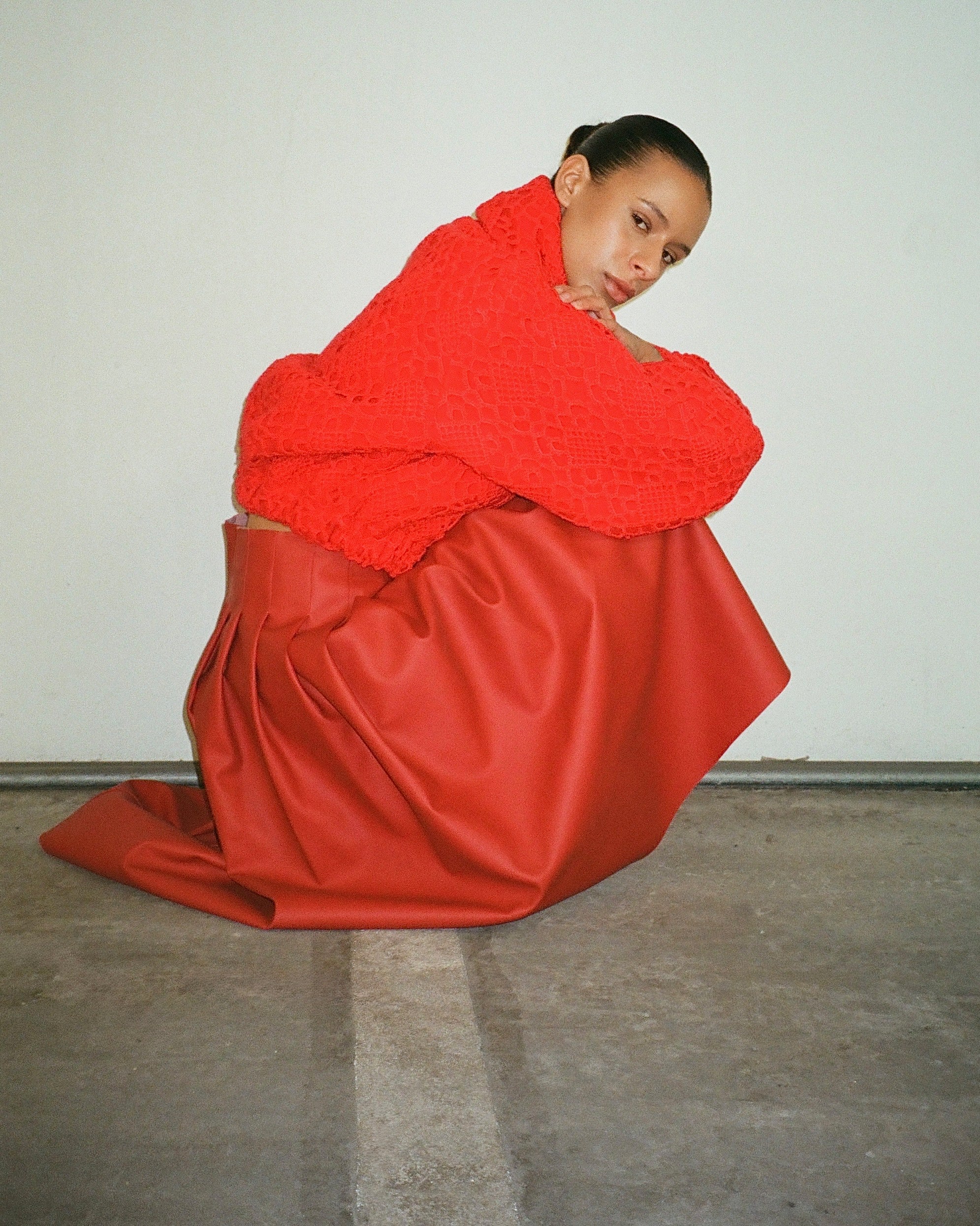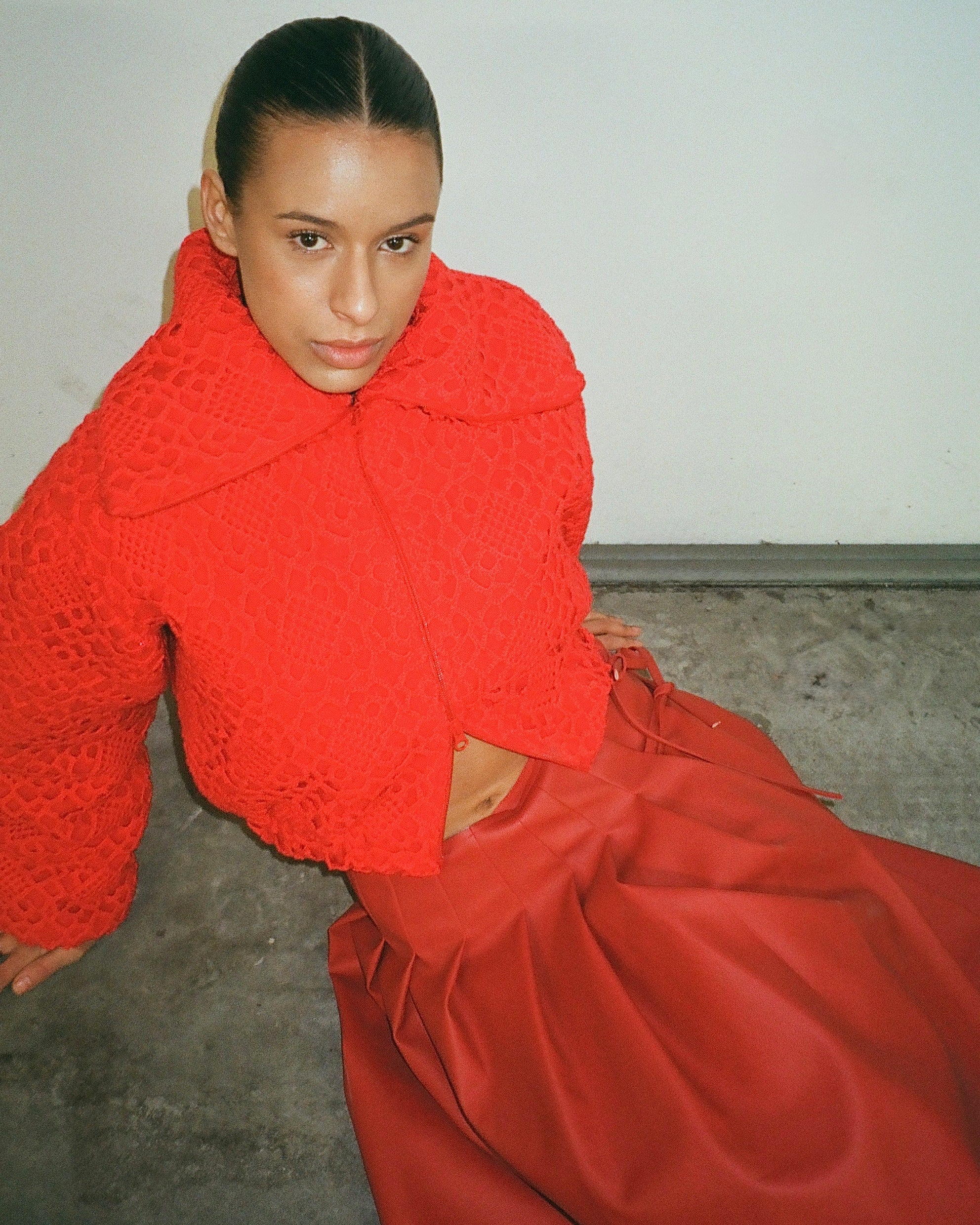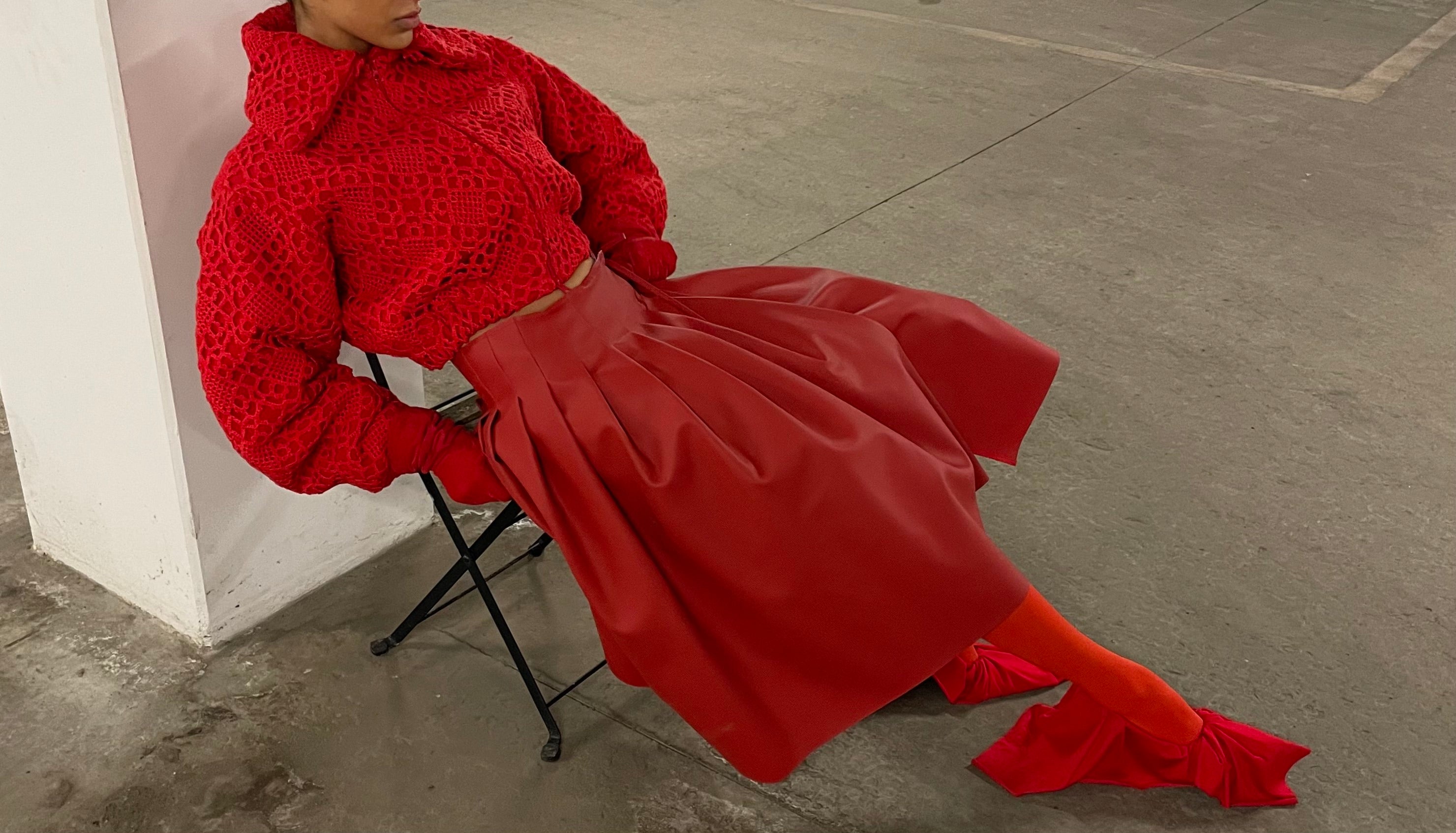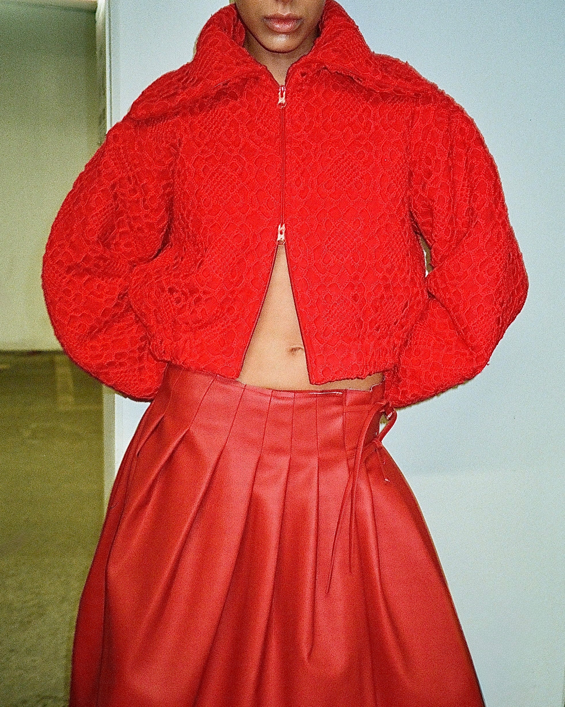 Meet Abena. A sharply cut bomber jacket in bold red, crafted from a vintage crocheted bedspread and double-faced wool. Finished with a multifunctional collar and double zipper.